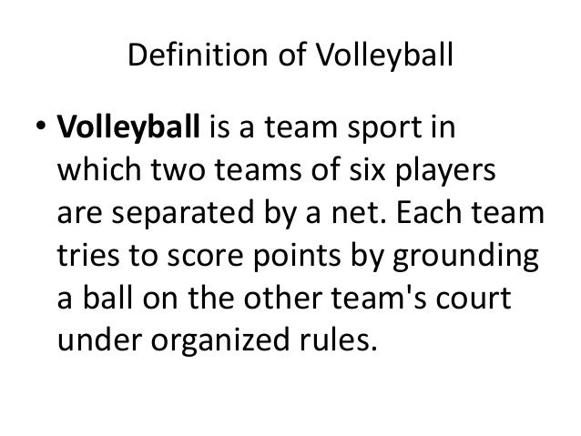 Alternative Title: mintonette Volleyball, game played by two teams, usually of six players on a side, in which the players use their hands to bat a back and forth over a high net, trying to make the ball touch the court within the opponents’ playing area before it can be returned. To prevent this a player on the opposing team bats the ball up and toward a teammate before it touches the court surface—that teammate may then volley it back across the net or bat it to a third teammate who volleys it across the net.